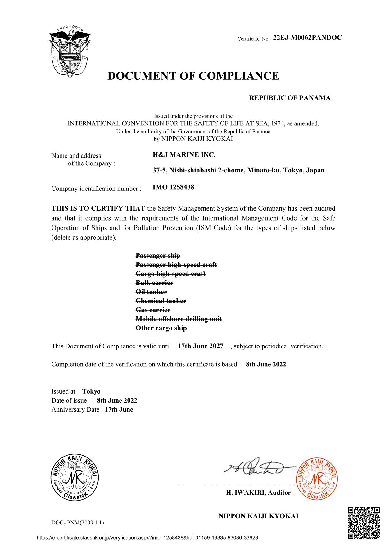 1997年6月にDOC (DOCUMENT OF COMPLIANCE = 適合証書)を取得、